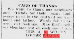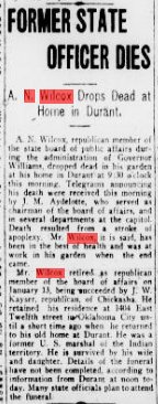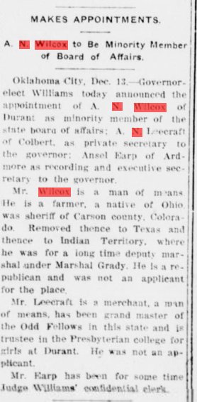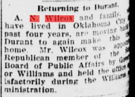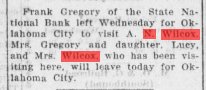 September 1916 "Frank Gregory and family have returned from a two weeks' visit with the family of A. N. Wilcox at Oklahoma City.""Honn. A. N. Wilcox, meemr of the State Board of Affairs, was in the city this week attending to some official businiess."
