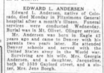 Edward Ludwig Anderson was born Nov 12, 1896 in Edwards, Eagle County, Colorado, father born in Thidsted Denmark, reference mother Anna Inga Anderson , living with him at 2709 Curtis. Edard was working for teh D & R.G.