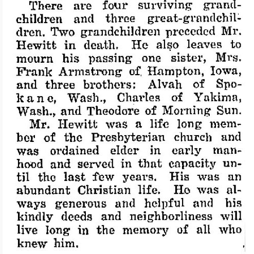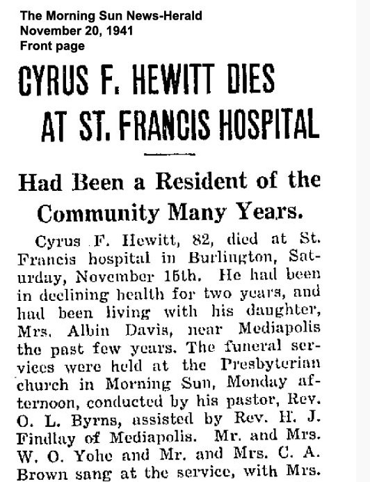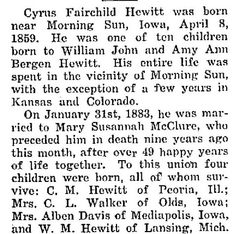 "Mary Susanna McClure was the daughter of Alexander and Julia Ann Montgomery McClure and was born near Morning Sun January 7, 1860, and passed away November 12, at the age of 72 years. She was united in marriage to Cyrus Hewitt, January 31, 1883. To them four children were born, Cecil M. Hewitt and William M. Hewitt of Peoria, Illinois, Mrs. Aleta M. Walker, Crawfordsville, and Mrs. Anna Davis of Mediapolis, all of whom with the husband survive. There are five grandchildren. There also survive two brothers and two sisters, Vanetta McClure, Winterset, Frank McClure, Forest Grove, Oregon, Mrs. W. C. Swan, Morning Sun and Mrs. Emma Caldwell of Flint, Michigan. Her entire life was spent in the vicinity of Morning Sun with the exception of three years spent in Colorado. Early in life she united with the United Presbyterian church and at the time of her marriage she transferred her membership to the Presbyterian church of Morning Sun."