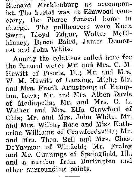 1926 Muscatine, Iowa "Mrs. Cyrus Hewitt, is visiting with her daughter. Mrs. Lee Walker, and family, at Crawfordsville. "