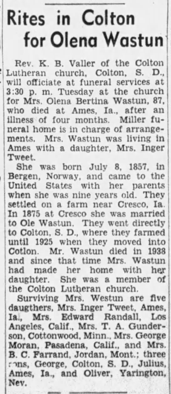 December 12, 1937 "Funeral services for Ole Wastun, pioneeer Colton farmer