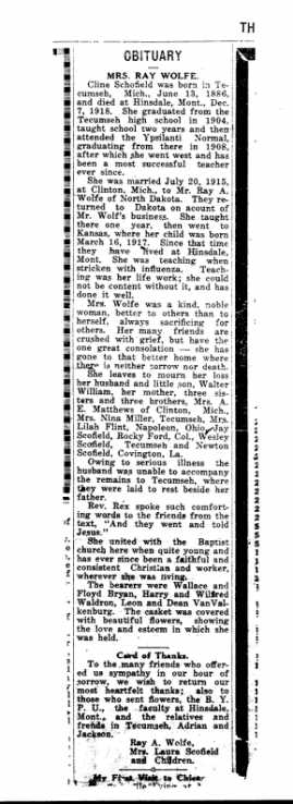 Wm. O. Wolfe and Pheba Orahood, married Cline M. Scofield, 29, born in Michigan to Wm. Scofield and Laura Bryan, on July 20, 1915 in Lenawee County, Michigan.