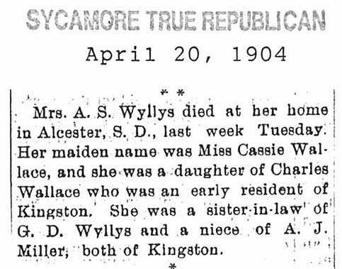 Sarah E. Wyllys 1851-1904 is buried in Union County, South Dakota # 149162139.
