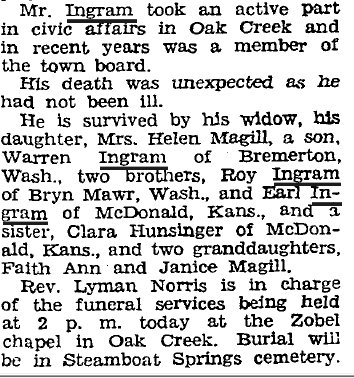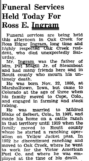 1944 Steamboat Springs "Mr. and Mrs. Ross Ingram and W.E. Blake of Oak Creek spent Sunday at the Mat Magill Jr. home in Steamboat Springs. The visitors are the parents and grandfather of Mrs. Magill." (might be great-uncle Charles or an uncle....)