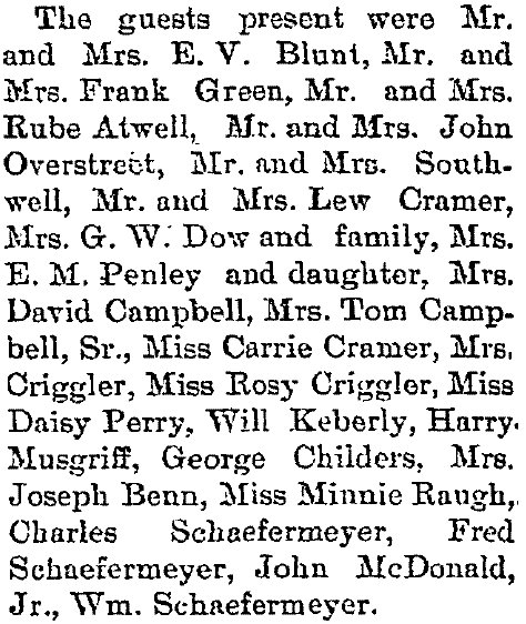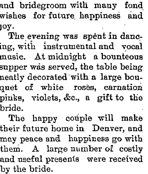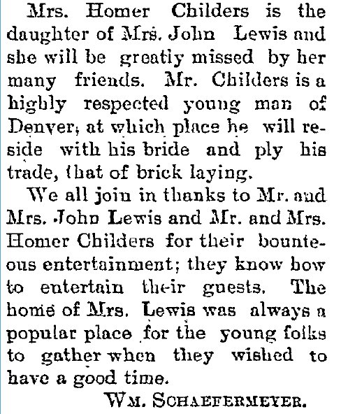1897 "Mrs. Homer Childers of Denver spent Sunday with her mother Mrs. John Lewis at Lehigh."