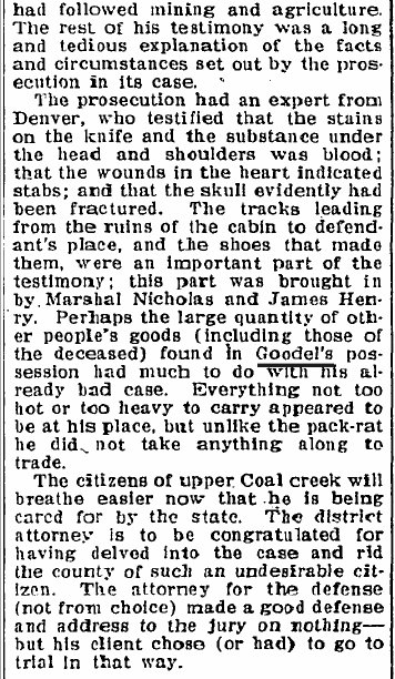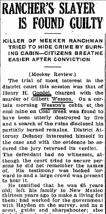 "In early 1900s Meeker, Aggie Watkins Henry was thrust into the spotlight when she became a key witness in the murder trial of Henry Goodell. The reason: She saw Goodell wearing a shirt belonging to Gil Wesson, the man he was accused of murdering.