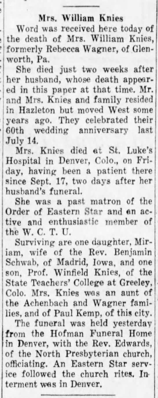 William and Rebecca (Wagner) Knies , 8 South 49 West
