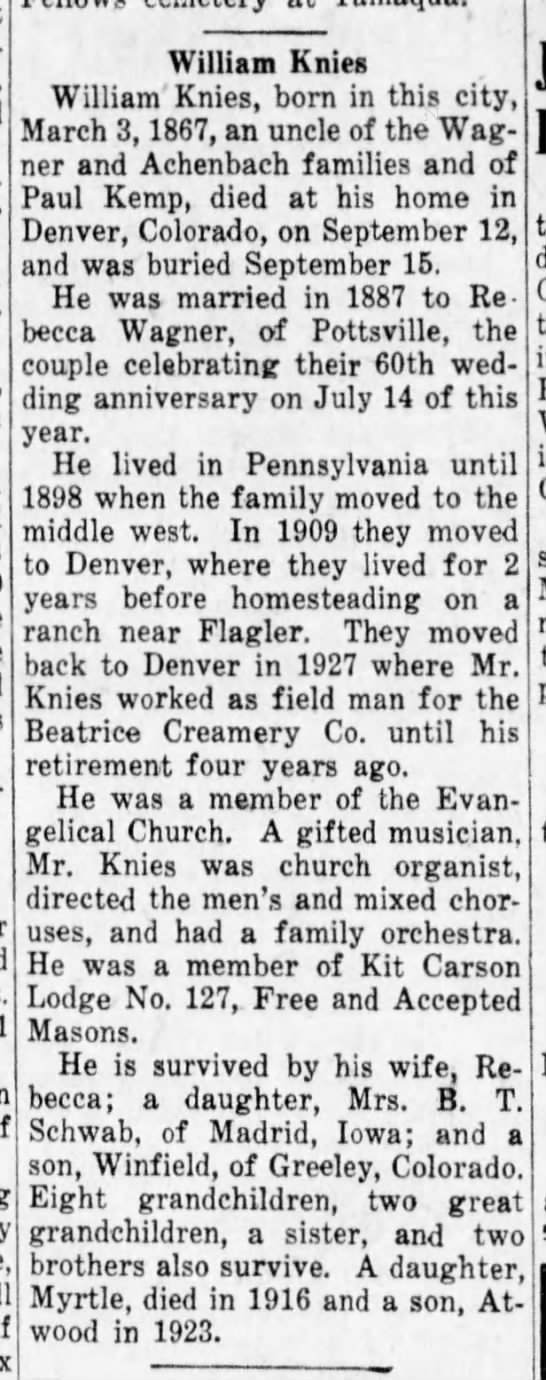 Hal Borland, wrote in "Country Editor's Boy" I wanted to take music lessons, and went to see Mr. Knies "He was a pleasant little man with a bristly brown mustache and a slight German accent. He was in the Beatrice cream station, wearing a long white apron, taking samples in test tubes, adding a few drops of acid, then spinning the tubes in a centrifuge turned by hand crank. When he took the tubes out, the percentage of butterfat could be read on the graduated scale on each tube. Farmers were paid for their cream in proportion to its butterfat content. He finished, wiped his hands on his apron, and said "My new pupil ! And what are you going to play? Well now, Atwood plays the cornet. Winfield plays the trombone, Miriam plays the cello. But Miriam will be away most of the winter. The cello! That's the instrument for you. Then we have a quintette all winter, with Mama at the piano and me with the fiddle." So I became a cellist, simply because Miriam Knies was going to be away most of the winter. The Knieses lived in quarters back of the cream station, and for the first month I went down there two evenings a week.... Flagler was a musical town, with enough real talent to be tolerant of beginners... There were two orchestras, that of Mr. Knies, which was basically a family group, and that led by C.A. Anderson, a tall handsome Scandinavian cobbler and harness maker who also played the violin. |