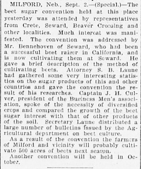 In 1898 Sidney B. Laune of Milford, Seward County, was a Republican candidate for the 29th District seat.