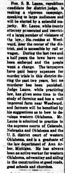 Sidney 1866-1928 is buried in Woodward, Oklahoma # 63495252 "Sidney Benton Laune , county attorney of Woodward County, died suddenly early Saturday at his home in Woodward. He was at his office on Friday. Laune was a pioneer resident of Woodward and a prominent attorney. He is survived by his widow, two sons and a daughter.