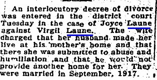 Paul Sidney Laune married Mary Terral in Springfield, Colorado August 6, 1922, performed by minister L.>C. Elver of Springfield.