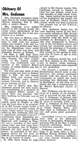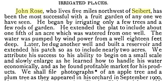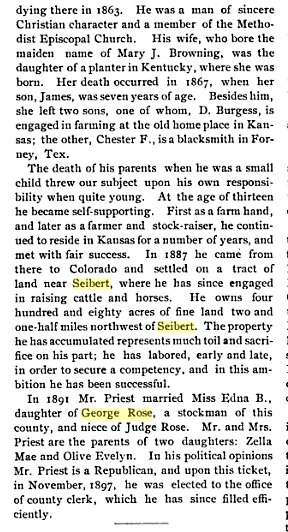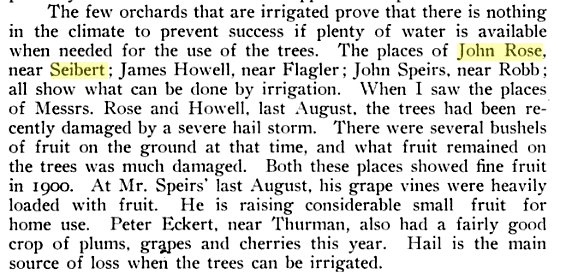 George Rose was born in Hillbourough, Illinois and died at 11:30 o'clock on Sept. 18, at Dinuba, Cali. Death was to acute pneumonia. Mr. And Mrs. Rose in company with their son, Milt, wife and child left the 25th day of August for a tour of the west and a trip to the Exposition at San Francisco. Death came suddenly and unexpectedly while the party was visiting at the home of their daughter, Mrs. Clara Heimbach. Mr. Rose had not been feeling very well but got up as usual Saturday morning and ate a light breakfast after which he had lain down as he complained of not feeling well. A physician was summoned and immediately responded to the call but the spirit had left its house of clay. When Mr. Rose was a young child his parents moved to Winterset, Iowa where he resided for a number of years. In 1862 he was united in marriage to Miss Susan H. Street. The young couple moved to Madison county, Iowa, where he followed his chosen vocation for life, that of farming. In 1887 he and his family moved to Eastern Colorado. For a number of years Mr. and Mrs. Rose have lived on "Lower Water Ranch" which is one of the best improved farms in this section of the country. Mr. Rose was quite a devotee to the growing of alfalfa and was well versed regarding its adaptation and cultivation in Eastern Colorado. Mr. And Mrs. Rose raised a family of nine children and the father was the first to be called from the family circle. Four sons, Jasper N., J. Milt of Siebert, Colo., Marion M. of San Francisco, Cali., and F. Rollie, of Minturn , Colo. The daughters are: Mrs. Clara Heimbach, of Dinuba, Cali., Mrs. Lena Smith of Imperial, Cali., Mrs. Ella Bloss of Deer Trail, Colo., and Mesdames Edna Priest and Mettie Shanahan, of Seibert. He also leaves 13 grandchildren and one great grandchild. Two brothers are left, Henderson Rose of Dallas City, Ill., who is past 87 years old and has made the trip alone twice this summer. Once to visit the brothers and the last time to attend his brothers John Rose, of Burlington, Colo., who is 85 years old. Besides these he leaves his wife who for over 53 years shared the sorrows as well as the joys side by side which comes into every life. Mrs. Rose was just seven years younger than her husband their birthdays being July 11. Mr. Rose was a good citizen, an honorable upright man and was well known and esteemed throughout the county. The body was brought in Wednesday night and services were held at the church Thursday afternoon, Rev. I E Hartman officiating. Many beautiful floral offerings covered the alter and casket. The Masonic order, of which he was a member for over 50 years, preformed (sic) their beautiful burial rites over the body of their brother. He together with his sons Milt and Jasper, belong to the Flagler lodge. Interment was made in the Seibert cemetery. Many friends extends (sic) sympathy to the family. Undertaker W. O. Campbell of the Hesserman Undertaking Co., came over from Hugo Thursday and conducted the funeral of George Rose. He also brought the hearse over from Hugo. John A. White, G. W. Runtley, J. W Alexander, E. T. Epperson, C. W. Clements, C. J Anderson, H.H. Kliewer, W. A. Borland, A. L. Lockwood, and H. L. Widenheimyr were the brother Masons from Flagler who came down to attend the funeral of George Rose. The resident members who assisted in the service were: G. W. Klockenteger, A. M. Blumberg, and W. S. Bruton. Mrs. Lena Smith, of Imperial, Cali., Mr. and Mrs. Bloss, of Deer Trail, Colo., Rollie Rose, of Minturn (sic), Colo. and Herbert Heimbach, of Dinuba, Cali., attended the funeral George Rose. Mesdames Smith and Bloss and Rollie Rose are children of the deceased. Messrs Bloss and Heimbach are sons-in-law. Mr. And Mrs. John Rose of Burlington and Henderson Rose, of Dallis (sic) City, Ill. Were also present . John and Henderson are brothers of the deceased. ------------------------------------------ Funeral services were held at the Seibert Evangelical Church on Wednesday afternoon, January 2, 1935 for Mrs. George Rose, who passed away on December 31. Rev. T.A. marks officiated and burial was made in the Siebert Cemetery. A quartet, consisting of Mrs. John Schekel, Miss Florence Sheets and Messrs J.E. and Robert Andre sang three appropriate numbers. A large number from this and other localities were present in honor of their beloved friend. Susan Henrietta Street was born July 11, 1845, near Shelbyville, Illinois and died December 31, 1935 (sic) near Seibert, Colorado, having reached the age of 89 years, 5 months, and twenty days. Her early years were spent in Illinois, later moving with her mother and family to Missouri where she lived until her marriage in May 1862 (sic—1863) to George Rose. After her marriage, she moved with her husband to Iowa, living in Dallas County (sic-Madison County) until the fall of 1887 when the family came to Colorado, locating near Hoyt and later moving to a homestead near Bovina. In 1898 the family again moved to the Seibert community where Mrs. Rose has since resided. In the fall of 1915, Mr. And Mrs. Rose with the J.M. Rose family went to San Francisco to visit relatives and to attend the World’s Fair. While on this Mr. Rose contracted pneumonia from which he never recovered and which caused his death. Mrs. Rose leaves to mourn her departure three sons; Marion M. of San Francisco, Francis R. of Seattle and J. Milton of Seibert; Four daughters. Mrs. G.D Smith of Brawley, California, Mrs. H.G. Heimbach of Bovina, Colorado and Mrs. J.H. Priest and Mrs. Mettie Love of Seibert. Besides the children there are 20 grandchildren and 20 great-grandchildren and many neighbors and friends who will miss her. CARD OF THANKS Through the columns of the Seibert Settler, we wish to express our deepest gratitude for the many acts and expressions of kindness and sympathy in the death of our beloved mother, Mrs. Susan Rose. It is impossible for us to see each of you so we take this means of thanking each and every one of you. J. M. Rose 