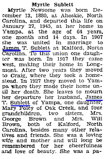 Possibly the James T. Sublette 1869-1959 buried in Routt County, # 135305440, with Myrtle 1880-1945.