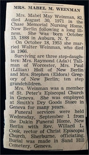 Eldora Gregory, 97 yrs. old of New Berlin, NY passed away on October 7, 2014 at the Norwich Rehabilitation & Nursing Center where she had resided for the past six months. Eldora Elma Weinman Gregory was born on March 6, 1917 to Walter and Elma Tewell Weinman in Seibert, Colorado where they were homesteaders. Eldora's family moved to New Berlin in 1930 and settled on Shacktown Mtn. The girls attended the one room school for a couple of years. They then moved to the Morris Turnpike and went to the Hoboken School. Eldora had to walk or ride the milk truck to New Berlin to attend high school where she graduated in 1936, second in her class! She went to nursing school at Binghamton City hospital for 1 year but quit as she was lonesome for the farm. Eldora married Stephen D. Gregory, a former classmate, in 1938. She was a housewife and helper on the farm which she enjoyed very much. Five sons were born to Stephen and Eldora; Gerald (Helen) of Mt. Upton, Delbert (Kathy) of Belen, New Mexico, Ray (Linda) of Norwich, Herbert (Sandy) of Homer and Everett (Victoria) of Pittsfield. Stephen passed away in 1983. She is also survived by a sister; Lillian Holl, 7 grandchildren, 10 great grandchildren and many nieces and nephews. She was predeceased by a sister; Ada Tallman and brothers-in-law; Ray Tallman and Paul Holl . Eldora lived in Chase Apartments in New Berlin for nearly 30 years. She worked for Chase Nursing Home for over 10 years and kept busy knitting, volunteering and baking cookies. Eldora wrote this obituary about 10 years ago! She was a "take charge lady". We will miss you Mom! A memorial service for Eldora will be held on Sunday, October 19, 2014 at 2:00 PM at the First United Methodist Church, New Berlin, NY with her granddaughter the Reverend Amy Gregory, officiating. There will be a time to greet the family from 1:00-2:00 PM prior to the funeral service. In lieu of flowers, memorial donations may be made to the First United Methodist Church, New Berlin or the Pittsfield Fire Department. ------------------------------------------------------------------- DECATUR, NY - Ada W. Tallman, 82, died Monday, Dec. 1, 2003, at A.O. Fox Memorial Hospital in Oneonta. She was born April 14, 1921, in Yellow Jacket, Colo., the daughter of Walter and Elma (Tewell) Weinmann. Her family moved to New Berlin in 1930, where she graduated from New Berlin Central School in 1939. Ada married Raymond L. Tallman on April 25, 1942, in Edmeston. She has been a resident of Worcester since 1959, after her husband's retirement from the US Army. She and her family lived in 12 states and 14 Army Posts, including three years in Tokyo, Japan, and three years in the Panama Canal Zone. Ada was a motor vehicle clerk for Otsego County. She worked in the Oneonta office from 1960 to 1983. She was a member of the Worcester American Legion Post 1584 Auxiliary since 1960, where she held most offices; the Order of the Eastern Star, Chapter 138, Schenevus, since 1961, serving as Worthy Matron in 1980, 1986 and 1987, also District Deputy Grand Matron, Otsego Schoharie District in 1988; a life and charter member of the Schenevus VFW Post 592 Auxiliary, and a member of the Board of Elections in Decatur for a number of years. She loved her family, gardening, bird watching, sewing of all sorts, knitting, crocheting and quilting. Survivors include her husband, Raymond L. Tallman Sr., of Decatur; her children, Elizabeth T. DeMartino of Marietta, Ga., Barbara J. Tallman of Phoenix, Ariz., and Raymond L. Jr. and Linda Tallman of Richmondville; grandchildren, Robert D. DeMartino, Sean R. and Jennifer DeMartino, Todd A. DeMartino, Jennifer A. Geerken and Rebecca L. Tallman; great-grandchildren, Connor and Mason DeMartino; two sisters, Eldora Gregory and Lillian Holl, both of New Berlin; and several nieces and nephews. Calling hours will be held Sunday, Dec. 7, from 6 to 8 p.m. at the E.J. Skinner Co. Funeral Chapel in Worcester. The American Legion Auxiliary service will start at 8 p.m. followed by the Order of the Eastern Star Service. The funeral service will be held at 11 a.m., Monday, Dec. 8, at the Worcester United Methodist Church, with the Rev. Jane Pykus, pastor officiating. Burial will follow at the Maple Grove Cemetery in Worcester. Contributions may be made to the Worcester Cub Scouts, Pack 19, care of Janette Gardner, 1095 Smith Road, Worcester, NY 12197. Funeral arrangements are by E.J. Skinner Co., 155 Main St., Worcester. Buried in Maple Grove # 96965958 |