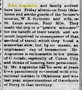 May 1908 "Mrs. M. A. Augustine of Perry, Oklahoma, arrived here Friday noon, to spend i the month of May with her grand children. La Verne and Donald Augustine."