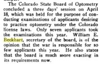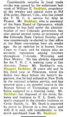 In his last thirty years, Mr. Beckhart practiced optometry. He attended the Chicago School of Optometry and was an offical in both the county and state Optometry associations.