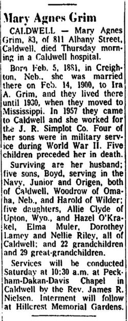 Mary is buried in Caldwell, Idaho 1881-1964 # 80166537.