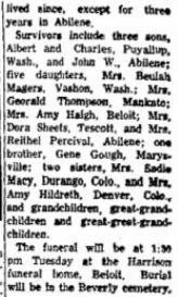 Charles /Gough/ (Charles /Gough/, John /Gough/) was born 12 SEP 1834 in Ross, Herefordshire, England, and died 19 JUN 1920 in home of B.F. Gough. He was buried in Beverly Cemetery, Kansas. He married Lucy Ann /Flanagan/ on 7 APR 1861 in Rushville, Schuyler County, Illinois, daughter of James /Flanagan/. She was born 16 FEB 1836 in Ohio, and died 19 JUN 1914 in Beverly, Kansas. She was buried in Beverly Cemetery, Kansas. Children of Charles /Gough/ and Lucy Ann /Flanagan/ are: George Wesley /Gough/ was born 12 NOV 1861, and died 19 JAN 1862 in Illinois. Charles Walter /Gough/ was born 15 JAN 1863 in Virginia, Illinois, and died 11 JUL 1940 in Centralia, Marion County, Illinois. Mary Jane /Gough/ was born 20 JAN 1864, and died 4 APR 1864 in Illinois. Martha Ann /Gough/ was born 20 JAN 1866 in Illinois, and died 4 APR 1866 in Illinois. Nettie Valentine /Gough/ was born 14 FEB 1867 in Meredosia, Illinois, and died 25 OCT 1963 in Beloit, Kansas. John William /Gough/ was born 4 SEP 1868 in Versailles, Missouri, and died 8 MAY 1954 in Frankfort, Kansas. Thomas "Ed" Morvan /Gough/ was born 4 APR 1870 in Illinois, and died 21 SEP 1943 in Alameda, California. Benjamin Franklin /Gough/ was born 17 JAN 1872 in Centralia, Illinois, and died 3 JUN 1962 in Centralia, Kansas. Robert Eugene /Gough/ was born 7 DEC 1873 in Centralia,Marion County, Illinois, and died 26 FEB 1967 in Marysville, KS. Ella Virginia /Gough/ was born 5 FEB 1876 in Centralia, Illinois, and died 20 FEB 1876 in Centralia, Illinois. Amy May /Gough/ was born 14 JAN 1877, and died FEB 1976 in Denver, Colorado. Sarah May "Sadie" /Gough/ was born 14 JAN 1877 in Centralia, Illinois, and died 7 JUN 1964 in Durango, Colorado. James Oliver /Gough/ was born 6 DEC 1882, and died 12 DEC 1882. |