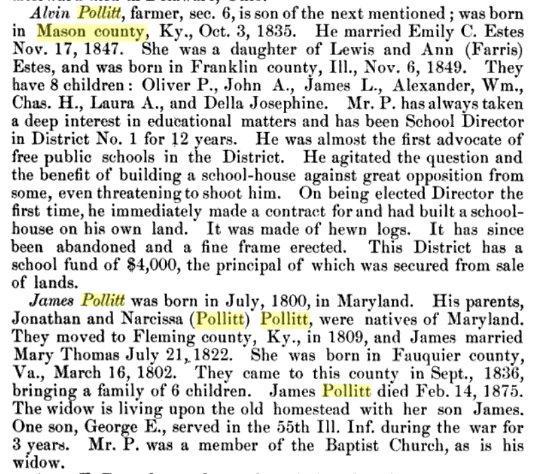|"John A. Pollitt is a native of this county and a son of one of the pioneers of the county. He was born March 14, 1855, and his parents were Alexander and Mary E. (Estes) Pollitt, natives of Kentucky. In 1875 John was united in marriage with Miss Mary Ball. Clara May is the name of their child. Mr. P. is engaged in farming upon sec. 28; P. O., Bryant.