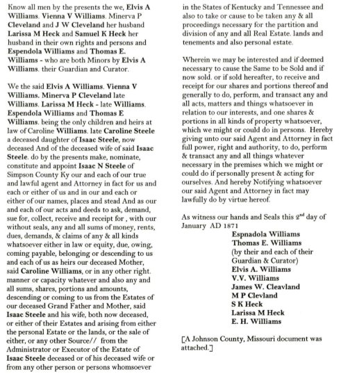 Missouri in 1857, children Thomas 1858, Parilee who married J. W> CLeveland, Vianna married R. D. Bandon of Gilroy, Claifornia, Melissa, the widow of Samuel K. Heck since 1884, residing in Flagler, COlorado, Duia dying in childhood in 1862.