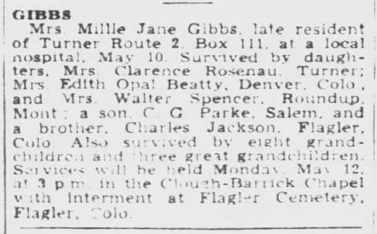 Millie J. Gibbs died May 10, 1952 in Marion County, Oregon.