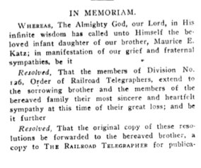 1913 Railroad Telegrapher "Bro. Maurice E. Katz is now with the Union Pacific, on Pullman second, good osition, pays near the top notch."