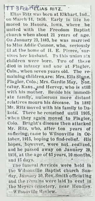 Elias Ritz and Nancy Barringer, married Rosa Adaline Conner, born in Cass County, Indiana