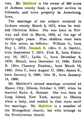 Hannah M. Malchos Smith 1874-1962 is buried in Redwood County, Minnesota # 117225945, on the same stone as her sisters Blanche G. Malchow 188--1970 and Lydia C. Rogers 1875-1957.