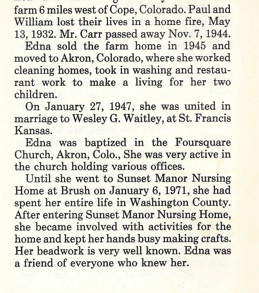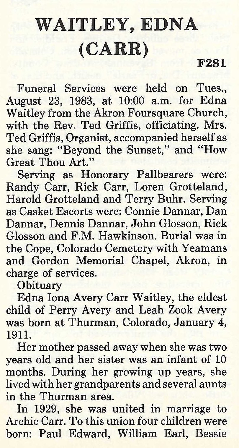 Edna Iona Avery Carr/Waitley, born 4 Jan 1911 in