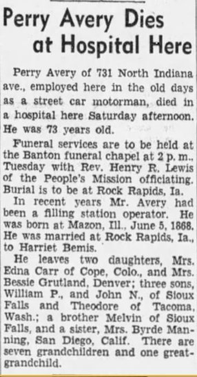 William Perry Avery 1894-1967 is buried in Sioux Falls # 155126451, spouses