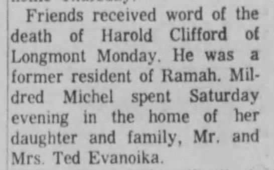 August 1958 Wray " Mr. and Mrs. Robert W. Davis and Philetta Jo drove to Ramah on Saturday for a short visit with the former’s sister,, Mrs. Harold Clifford, and family. They went to Florence the following morning to spend the day with C. D. Davis, father of the Wray man. They returned home Sunday night.."