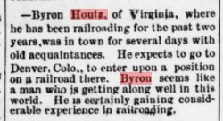 October 1884 "Byron Houtz has gone south. He has accepted a good position on a rail road in Maryland."