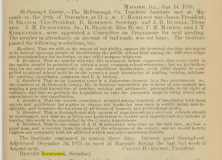 In 1880 Tazewell County, Illinois, Bennet Robinson is a school teacher, 36, born in West Virginia,