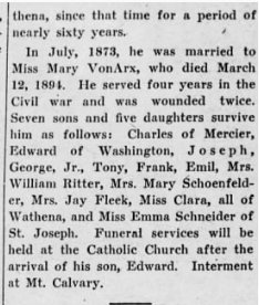 Edward John Schneider registered for WWI in Doniphan County, Kansas, born February 17, 1882, reference Clara Schneider of Mathena.