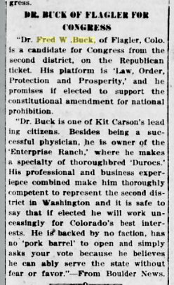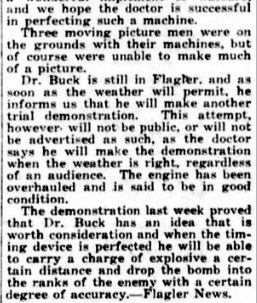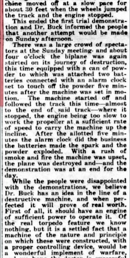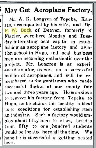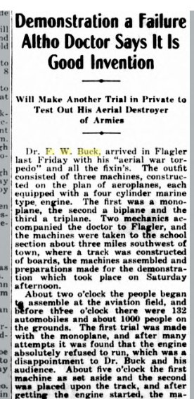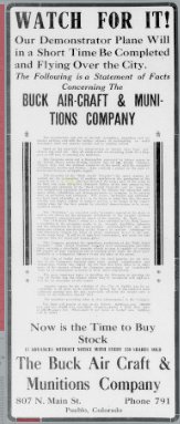 HISTORY OF COLORAO Dr. Frederick W. Buck is well known as a physician and is coming prominently to the front as an inventor, being now at the head of the Buck Aircraft & Munitions Company, in which connection he has brought forth an aircraft that it is believed will largely revolutionize flying and torpedo use in aviation. Dr. Buck was born in Allegan county, Michigan, on the 13th of March, 1873, a son of David S. and H. A. (Richmond) Buck. The mother died when he was but three years of age. He was educated in the public schools but when a youth of fourteen years left home and when but sixteen years of age taught in the rural schools of his native state. He afterward went upon the road as a commercial traveler and for three years he was engaged in government work on the Mississippi river. While employed in these different capacities he saved the money which enabled him to take up the study of medicine, the profession which he felt that he wished to enter. He first graduated from the Physio-medical College of Chicago in 1898 and then secured his degree of M. E. from the National College of Electrotherapeutics and afterward became a student in the Central Medical College at St. Joseph, Missouri, in which he completed his studies in 1902. He first located for practice at Grand Rapids, Michigan, and afterward became connected with a private sanitarium at Aberdeen, South Dakota. In 1905 he removed to Flagler, Colorado, where he purchased a ranch and in addition to practicing his profession he has pursued his investigations and experiments, resulting in notable inventions. He has organized the Buck Aircraft & Munitions Company, which was incorporated for three million dollars on the 27th of January, 1917, for the purpose of manufacturing and selling aircraft, aeroplanes, torpedoes and explosive carriers and for the further purpose of maintaining an aerial passenger, mail and express service and an aviation school. The company are manufacturing at Pueblo, Colorado. The officers are: Dr. F. W. Buck. president; D. D. Buck, vice president; and John G. Powell, of Denver, secretary and treasurer. These constitute the board of directors together with A. C. Troutman, of Palisade. Nebraska, and F. E. Gibson, of Kokomo, Colorado. For five years Dr. Buck has been working upon the invention and evolution of the Buck aerial torpedo, which he has succeeded in bringing to its present state of perfection and efficiency. This (the aerial torpedo) is one American invention that Germany was not able to purchase. After turning down their first two offers of one and five million dollars, in June, 1916, - ten months before we entered the war, her agents raised the bid to ten million dollars and received the truly American reply: "The Kaiser hasn't money enough in his kingdom to buy it." One of the devices which he has introduced is the stabilizer, so essential to the automatic control of the plane, as well as the device for the automatic detachment of the torpedo carrying the explosive. In regard to the former, Santos Dumont, who only saw patent drawings of the torpedo and an explanation of the stabilizer, said: "It's funny as long as I have been flying that I never thought of your principle of stabilization. I guess it's because it was too simple for me to see it." The editor of the Aerial Age said: "We certainly believe you are bound to succeed," while Lee Wallace, aeronautical engineer and designer, said: "On account of your reduction in weight, head resistance and skin friction, you should get from ten to twenty-five miles per hour greater speed with same motor than other machines of the same design." The inventor of the gyroscope, Elmer A. Sperry, expressed himself in these words: "There is no question about being able to direct an aerial torpedo or airplane without a pilot. The only thing you have done is to beat us to it with your patents." All aviators and aeronautical engineers agree 'that the aircraft set forth by Dr. Buck will reduce weight, head resistance and skin friction, and eliminate sideslip and skidding. In 1894, Dr. Buck was united in marriage to Miss Hattie Parmalee, of Parmalee, Michigan, and to them have been born a son and a daughter, Lawrence and Nellie. In 1912 Dr. Buck was a candidate for the legislature and in 1914 was a candidate before the primaries for congress and was beaten by only ninety-six votes. He has always given his political allegiance to the republican party, of which he is a stanch champion. Fraternally he is a Mason, an Odd Fellow and an Elk, but more than that he is a scientist and Inventor who is prompted by the most patriotic purposes in endeavoring to perfect and build his aircraft, realizing how important this is at the present hour of crisis in the nation's history. |