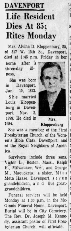and George at home; one brother, Max Kloppenburg of Davenport,