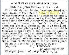 July 10, 1894 "John E. Sims, of Ward [Colo.], a single man and aged 35 years,