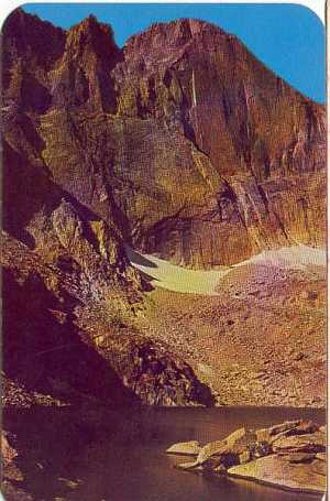 Chasm Lake and Long's Peak in Rocky Mountain National Park, Colorado. From this rock-bound lake the east face of Long's Peak towers nearly 3,000 feet in an almost vertical rise to an altitude of 14,255 ft.