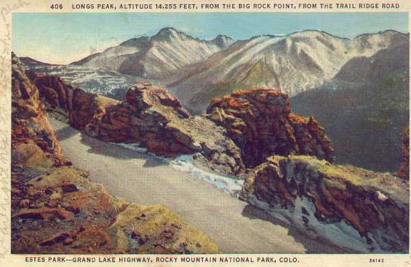 The Trail Ridge Road, A new route to the top of Fall River Pass, up the east side of the Continental Divide was completed in 1931. This road climbs the valleys and skirts the slopes to emerge on the top of the great ridge and circles about the mountain tops giving a succession of panoramic views of the jumbled mountains and gorges and valleys.