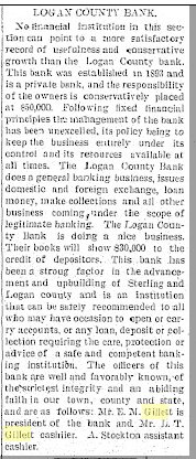 A. C. Gillett, an automobile dealer of Fort Morgan, being proprietor of the Gillett Garage, is known to his friends, - and they are many - by the name of Ace Gillett. He was born in Holyoke, Colorado, November 26, 1893, and is a son of E. M. and Annie (Rowe) Gillett, who were natives of Iowa and of Illinois respectively. The father became a hardware merchant of Holyoke, Colorado, where he located about 188S, but for the past twenty years or more he has resided at Sterling, Colorado, where he occupies the position of president of the Logan County National Bank. He has long figured prominently in business and financial circles of this, community and has had not a little to do with shaping material progress and upbuilding in that locality. His wife is also living. A. C. Gillett was reared and educated in Sterling, Colorado, being graduated from the high school of that place in 1911. He afterward entered Culver Military Academy at Culver, Indiana, and still later pursued a two years' course in the State University of Wisconsin. In 1914 he was graduated from a business college at Burlington, Iowa, and having thus qualified for life's practical and responsible duties, worked in a bank and also at railroading in Burlington for six months. In December, 1914, he arrived in Port Morgan, Colorado, where he engaged in the automobile business, handling the Overland and Willys-Knight cars and the Republic truck. He now has> a very extensive patronage and his business is steadily growing. In 1916 he erected a fine modern two- story garage seventy-five by one hundred feet, with basement under it. This he expects to enlarge as soon as the war is over. He also owns a forty acre tract of land, which he rents, deriving therefrom a good income, and he is likewise owner of an attractive home at No. 505 East Bijou street, in Fort Morgan, and a residence lot one hundred and fifty feet square. Mr. Gillett was married in March, 1914, to Miss Nellie E. Neibert of Fairfield. Iowa, and they are well known socially in Fort Morgan, where they have many friends. Mr. Gillett is a member of the Benevolent Protective Order of Elks and has been initiated into the Masonic order. Politically he maintains an independent course, voting for men and measures rather than party. His religious, faith is that of the Methodist Episcopal church and his life is actuated by high and honorable principles. In business connections he has made a most creditable record and is. now one of the prosperous automobile men of his section of the state. He utilizes his entire building in the conduct of his business, handles all kinds of automobile accessories, and something of the volume of his patronage is indicated in the fact that he now employs twenty-two men. He is a young man of but twenty-five years and his record is one that many a merchant or dealer of twice that age might well envy. |