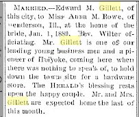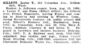 Note: Book on Benoni Gillett and from Carol Thompson, his Great grand daughter. Lester Tucker Gillett, Jr. lived with his brother John on the farm for nearly 5 years with their mother keeping house for them until the fall of 1886. He attended public schools in Jefferson Co., and was a graduate of Elliotts Business College of Burlington Iowa. Specializing in commercial Law and banking. In Sept of 1887 with his brother E. M. he engaged in the hardware and harness business at Holyoke, Colorado. This was the first store in this town. With drought homesteaders abandoned farms and left business dwindeled and in the spring of 1891 L. T. took civil service examination for Railway mail service, made clerk in Aug of 1891. From Denver to ogden utah. Dec 1891 he exchanged that run for one from Salida to Silverton Co. with headquaters at Salido Co. In march of 1892 he made a trip to CA., and then north to Vancouver B.C. looking for a bank location. In Aug of 1893 he vistited the Worlds Fair in Chicago, with his fiancee. In Competince Iowa he married Mary Ulrey. Death: 1937 Long Beach, Los Angeles, California, USA