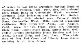 In 1920 Ed was still in Sterling, and Lester was in Goldendale. The Goldendale Sentinel, Goldendale, WA., March 18, 1920, page 7 Taylor Z Gillett, born at Brookville, Iowa, November 21, 1848, married December 15, 1874, to Mary Mowery, died March 5th, 1920. He was one of the progressive and successful farmers of Jefferson county, Iowa, during the active years of his life, and while on the farm his three children, a son and two daughters, were born. In 1897, with his son, K.C. Gillett, he organized the Farmers’ Savings Bank, of Packwood, Iowa, and moved to the town of the Packwood to look after the management of the bank. In 1901, he became interested with his brothers in the Logan County National Bank, of Sterling, Colorado, to which place he moved into 1902. At this place he also assisted in the organization and managed the PlatteValley Lumber and Mercantile Company. In 1905, with his brother, L.T. Gillett, he became interested in the banking business of Klickitat county, his son, K.C. Gillett, taking charge of the State Bank of Goldendale in that year as president, but his death in 1907 was such a shock to his father that he was forced to give up the management of the business in Colorado and practically retired from business life. He moved to Washington state in 1913, making his home in White Salmon until 1916, when he moved to Goldendale, building the home on Columbus avenue, which he occupied until his death. At the time of his death he was president of the Farmers’ State Bank of Centerville, vice-president of the State Bank of Goldendale, and the Columbia State Bank of White Salmon. He was always actively interested in anything for the upbuilding of the community, a kind and generous father and a dependable neighbor and friend, and in his death the community suffers a great loss. He is survived by his wife and two daughters, Mrs. H.W. Loughary of this city, and Mrs. George A. Reed of White Salmon; four brothers, L.T. Gillett of Goldendale; E.M. Gillett of Sterling, Colorado; John R. Gillett of Quincy, Illinois, and W.R. Gillett of Fostoria, Iowa; two sisters, Ellen M. Stockton, Buena Park, California, and Eliza J. Pollock of Sterling, Colorado. The funeral services were held in Portland Tuesday, March 9th, and the body was laid to rest in the Mt. Scott Park cemetery. |