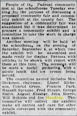 THANKS TO ANN ANDERSON In March of 1913 Ida (Peters) Hundrup and Joseph Henry Hundrup came from eastern Nebraska by train to Logan County, Colorado to homestead 160 aceres seventeen miles north of Sterling. At this time they had five children - Mildred, John, Gertrude, Agnes, and Inez. Inez was only six weeks old. My parents were tired of renting and wanted a place to call their own. They arrived at a small town called Winston, which was three miles east of their homestead. They were met by friends and stayed with them until they could build something of their own. Their furniture, machinery, a few horses and cows were shipped here by train. They first had a water well dug; then they constructed a one-room building of cement and rock. They lived in this until thier house was built. The interior of the house was finished after they moved into it. The one-room building was later used as a chicken coop. They got their mail at Winston, until later a Star Route was established from Padtroni. Deliveries were on Monday, Wedensday and Friday. Padroni was a small town seven miles south and east of them. It had a bank,lumber yard, grocery store a train depot and a few other establishments. Horses and wagons being the only transporation, only a few trips were made into Sterling for supplies. People depended a lot on sending catalogue orders. Two miles south of the homestead was a one-room country school called Valentine. First grade through the eighth were taught. We children either walked, drove a horse and cart, or rode a pony to school. By 1918 there had been two more children born into the family - Anton and Anne (myself). Two and a half miles south and west of our place was a church called Bethlehem. I remember of times, especially in the winter, when our family would dress warm, take blankets and drive our horses and wagon to curch and school programs. When we were ready to come home, our parents would bed us down in the wagon in warm blankets. We would lay and listen to the wheels of the wagon making a crunching, singing noise as they rolled through the cold snow. We would be asleep when arriving home. Our parents bought their first car in 1925. It was a "Star." It had snap-on curtains with isinglass windows. Dad was good at carpentry and blacksmithing. Over the years he constructed many buildings on the place. They were all constructed of cement and rock walls. The rocks were hauled by horses and wagon from hills north of the place. He used barbed wire and scrap iron to re-inforce the cement around windows, doors and corners. He repaired and rebuilt his farm machinery with his forge and tools in his own shop. One of our fall crops for several years was red, Burbank potatoes. Many sacks of these were sold to neighbors and grocery stores for $1.50 per hundred pounds. Mother raised ducks and geese for several years. The feathers were picked to make feather beds and pillows. She had two gardens from which many vegetables were canned each fall. She baked all of our bread, and made butter from our cream. They did all their butchering of hogs and cattle for our meat. They built a special building with two compartments; one side for rendering lard and making soap andthe other sied for smoking the hams, link sausage and bacons. Excess cream and eggs were sold at the depot in Padroni. This money nearly paid for the groceries we would need to buy. Homesteading was certainly a challenge. It took lots of faith in God, determination and fortitude to accomplish their goal. After all teh ups and downs, it was a great life, shared and remembered by all the family. Many winter evenings were spent by the famly playing different games around the dining room table, looking at pictures through the steroscope or listening to our mother play here favorite hyms and songs on her German mad Honer accordian. The 1930's were trying years for everyone. They were known as the dust-bowl days. There was also a great plague of grasshoppers. Even so, my parents managed to acquire more land. Our saddest experience was when our son and brother "Tony" (Anton) was killed in June 1, 1944 near Rome, Italy. He had married a Kentucky girl named Marian Hudson, in August 1943. We girls all married and went our own way. John remained single and lived with our parents here on the hnomestead and continued the farming. Mother passed away August 31, 1956. Dad passed away November 20, 1964. |