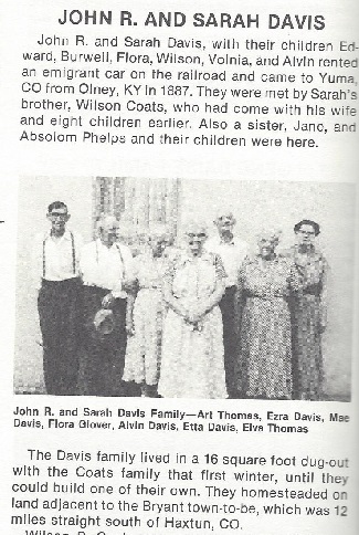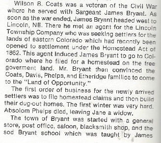 Infantry, Company E These families that left Hopkins Co., KY in 1887 and homesteaded in what is now Phillips Co. Colorado at a site called (Old) Bryant. Wilson B. Coats was my great grandfather, his brother-in-laws were Absalom Phelps and John R. Davis, Whitson Etheridge, son-in-law of Phelps, and Eli Coats, married and the oldest son of Wilson Coats all traveled to eastern Colorado in the late summer of 1887. Both Wilson B Coats and Absalom Phelps fought in the Civil War for the North. Absalom and Mary Jane never made it to Wyoming. Absalom died in Bryant, Co. Henry and Louella came on to Wyoming with George and Rebecca. George and Rebecca settled in Guernsey,Wy and Henry and Louella settled in Wheatland, WY about 30 miles southwest of Guernsey."