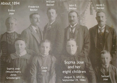 Sophia Schachterle was the widow of Johann Friedrich Becker Jr. in Russia about 1879. Sophia was then widowed from Rev. Emanuel Joseph Jose Jr. in November 1887. This photo was taken between 1894 and 1900, with all of her children, when she returned to Colorado and settled a homestead directly west of her brother Gottfried Schachterle. Shortly after 1900, Sophia married Jacob Billigmeier and lived north of Sutton, Nebraska. She died there in September 1906. Her grave location is unknown but she may be buried in an unmarked grave near her sister Christine Trautman at Emanuel Reformed Cemetery (northwest of Sutton) or an unmarked grave near Jacob Billigmeier at Salem Reformed Church Cemetery (northeast of Sutton).