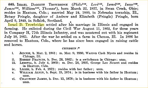 The Trowbridge family is also in McLean County in 1880, with Israel, 43, Betsy 39. Jennie 19, Robert 17, Ledotia 11, Lizzie 8, Willie 6, and Chancy 2. Israel D. Trowbridge enlisted August 1862, served in Co H., 77th Illinois, mustered out July 1865 at Mobile, Alabama.