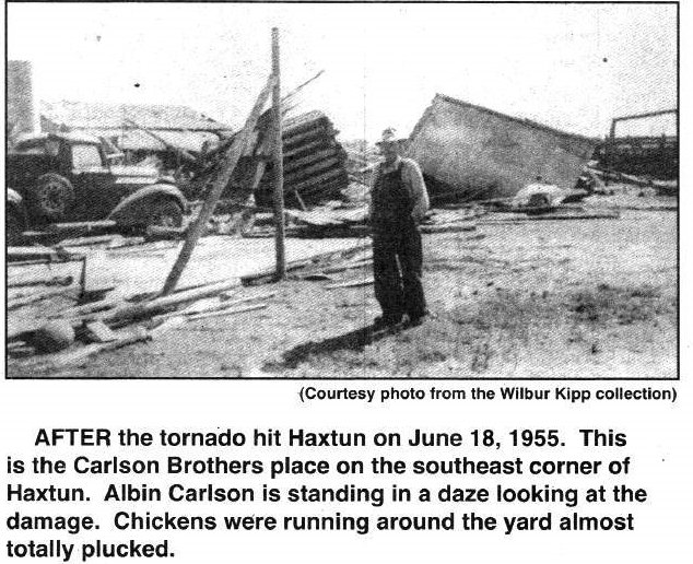 approximately five miles west of Holyoke on Highway 6. He was 52. Funeral services were held Monday at the Church of the Brethren at 2 p.m. with the Rev. Roy Pfaltzgraff officiating. Burial was in the Haxtun cemetery. Carlson, a son of Albin and Mildred L. Merris Carlson, was born in Haxtun October 23, 1924. He attended school in Highland Center and graduated from Holgate High School in Holgate, Ohio in 1942. In April 1943, he was inducted into the U.S. Army. He was discharged in January 1946. After his discharge, Carlson worked for J.R. Dall Ford in Elyria, Ohio as an auto mechanic. On July 3, 1947, he was united in marriage with Helen Anita Walker. They moved to a farm in Colorado in 1956. Survivors include his parents, Albin Carlson of Haxtun and Mildred Carlson of Chula Vista, California; his wife Helen of Haxtun; three daughters, Mrs. Susan Garretson of Wheat Ridge, Colorado, Sandra Carlson of Haxtun and Mrs. Shirley Marvis of Fort Morgan, Colorado. Also, his sister, Mrs. Garth (Imogene) Gaylord of Chula Vista, California; and grandchildren Jennifer and Christopher Garretson and Trevar Marvis. Carlson was a member of the Haxtun Masonic Lodge No. 164, the American Legion and the VFW. Pallbearers included Bill Kain, Royce Potter, Marion Russell, Richard Potter, Harry Salvador and Dale Reyher. Pianist Mrs. Harry Salvador played “How Great Thou Art” and “Beyond the Sunset” as service selections. ------------------------------------------------------------------------------- Haxtun-Fleming Herald, Haxtun, Colorado, April 6, 2005 |