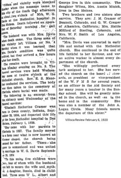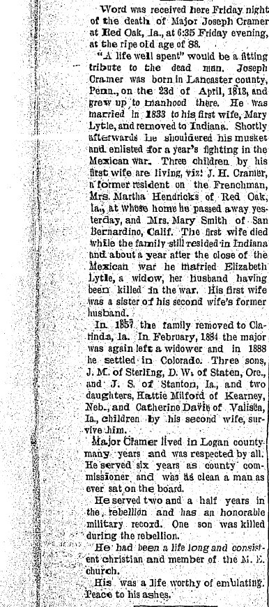 Joseph Cramer -1813-1900 is buried in Clarinda, Page County, as is daughter Elizabeth (Cramer) Davie 1856-1920.