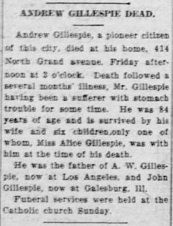 August 1900 "Andrew Gillespie Sr. has three cows for sale. Call at the farm of his son Andy Gillespie."