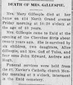 John William Gillespie 1867-1953 - died in California, buried in Calvary Cemetery, Enid Oklahoma.